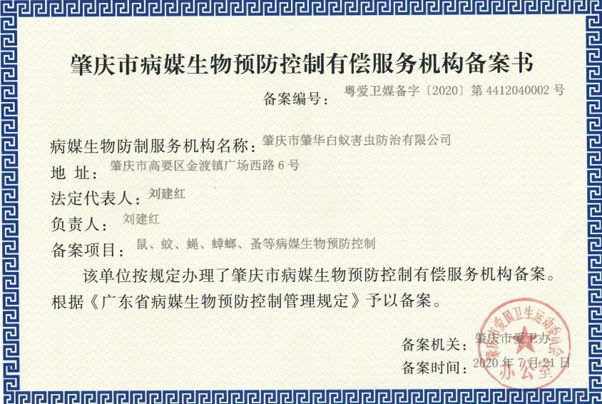 2020年,我公司在多部门单位的关心及指导下,不断地完善自我及提高服务质量,顺利通过了“肇庆市病媒生物预防控制有偿服务机构”备案公示及广东省白蚁学会“白蚁防治单位专业技术和服务能力水平评价等级证书”